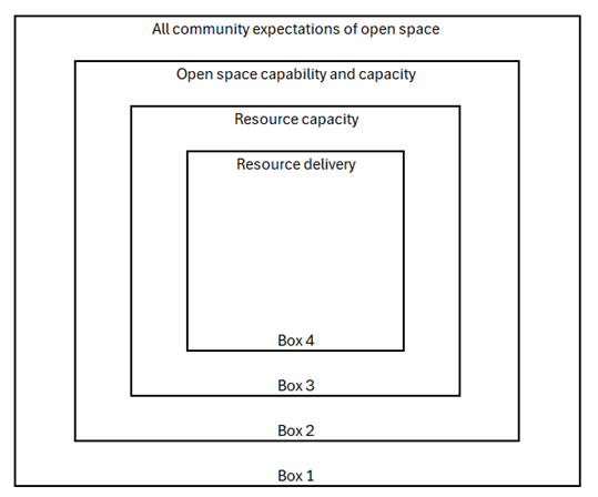I explained that we know community members have a range of expectations of their open spaces (Box 1). We also know that the existing open space network is only capable of providing for a range of activities, and that its capacity to accommodate some of those activities is limited (i.e. all community expectations can’t be met) (Box 2). The resources available for open spaces are limited (Box 3) and the use of those resources is not without losses and waste (Box 4). In an ideal world, there would be no gaps between the boxes.