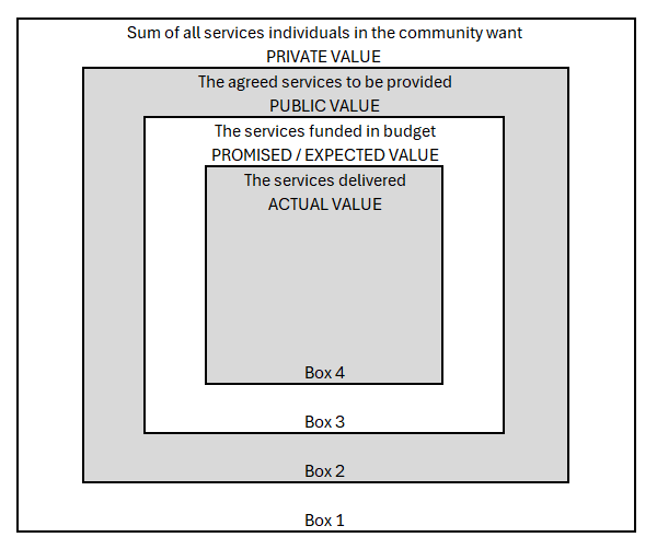 Box 1 is really the sum of all expectations of private value held by the members of the community (i.e. the total of what each person would want the council to do and evidenced by the individual service requests made of the council). Box 2 is the public value agreed by the community (i.e. what is agreed by the community to be valuable to do with their collective resources and evidenced by council policy, strategies and plans). Box 3 is the amount of resources the council is able to allocate to implement those policies, strategies and plans in any given year (i.e. the annual budget). Finally, Box 4 is what actually gets done using those resources (i.e. the services delivered in accordance with the budget and council policies, strategies and plans).