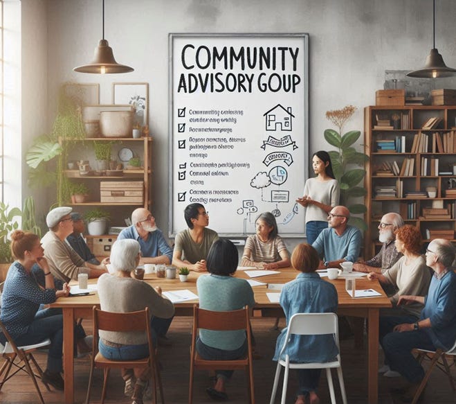 The next meeting of the Advisory Group is scheduled for 8.00 tonight. The Chair, a councillor, drops by to discuss how we can keep the group 'on topic' at the meeting.