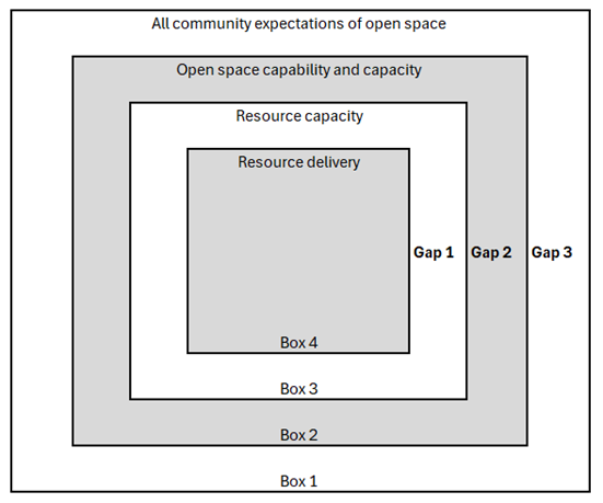 The gap that they selected for their work was between the sum of community expectations of open spaces and what the existing open spaces are capable of providing (Gap 3). They saw advising on this gap as the best use of their time and most influential because it could help the Council understand how to optimise the investment in management and development of open spaces.